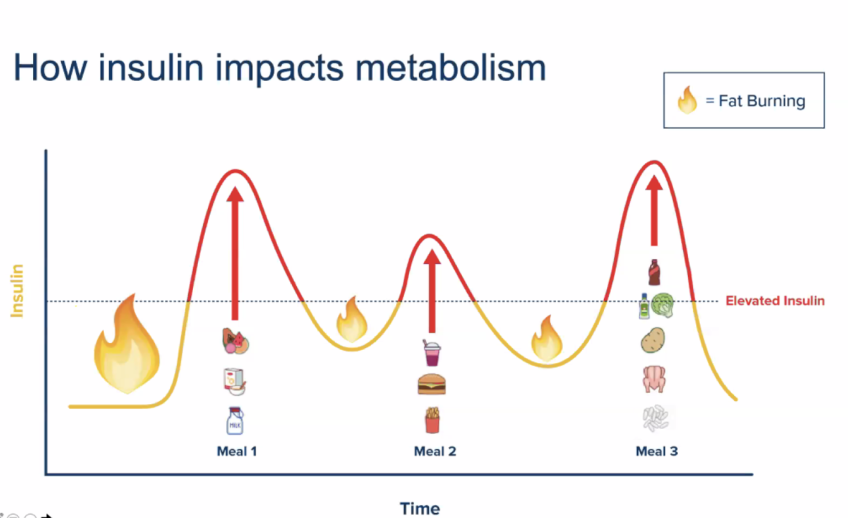 ทุกครั้งที่เรารับประทานอาหาร น้ำตาลในเลือดของเราจะเพิ่มขึ้น และระดับอินซูลินก็เพิ่มขึ้นเช่นเดียวกัน อินซูลินเป็นฮอร์โมนที่มีหน้าที่เปิดประตูให้น้ำตาลส่งไปในเซลล์ทั่วร่างกาย หรือทีเรียกว่า (กลูโคส) เมื่อมีการผลิตอินซูลินมาก เมื่อนั้นจะถูกส่งไปยังตับว่าจำเป็นต้องเก็บไขมันไว้ในร่างกายและไม่ได้ใช้เป็นพลังงาน ในขนาดเดียวกันร่างกายจะใช้คาร์โบไฮเดรตและน้ำตาลเป็นพลังงานแทน นี่คือวิธีการทำงานของวิทยาศาสตร์ร่างกายและถูกตั้งโปรแกรมไว้ เมื่อระดับอินซูลินสูง การเผาผลาญไขมันจะไม่เกิดขึ้นหรือการทำงานน้อยมาก